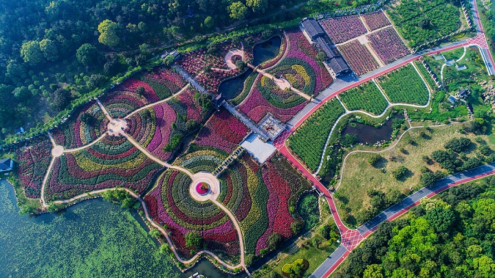 更是将各色花卉分色块种植,拼接成巨型“月季花瓣”,玫红、橙黄、雪白层层晕染,从高空俯瞰,宛如一朵朵的月季绽放在绿野中央,花瓣层层叠叠,色彩绚丽夺目。