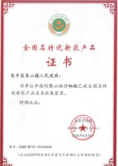东山镇是中国四大传统枇杷产区之一,枇杷亦是东山镇第一大果品产业。东山白沙枇杷不仅在群众中“有口皆碑”,近年来更是屡获“国字号”大奖。2020年4月,农业农村部授予东山镇“东山白沙枇杷”农产品地理标志登记证书;2020年10月,“东山白沙枇杷”被国家知识产权局认定为地理标志证明商标。东山镇还先后获得“江苏省农业特色小镇”“东山枇杷小镇”“枇杷科技小院”“江苏省特色农产品优势区”等荣誉称号。