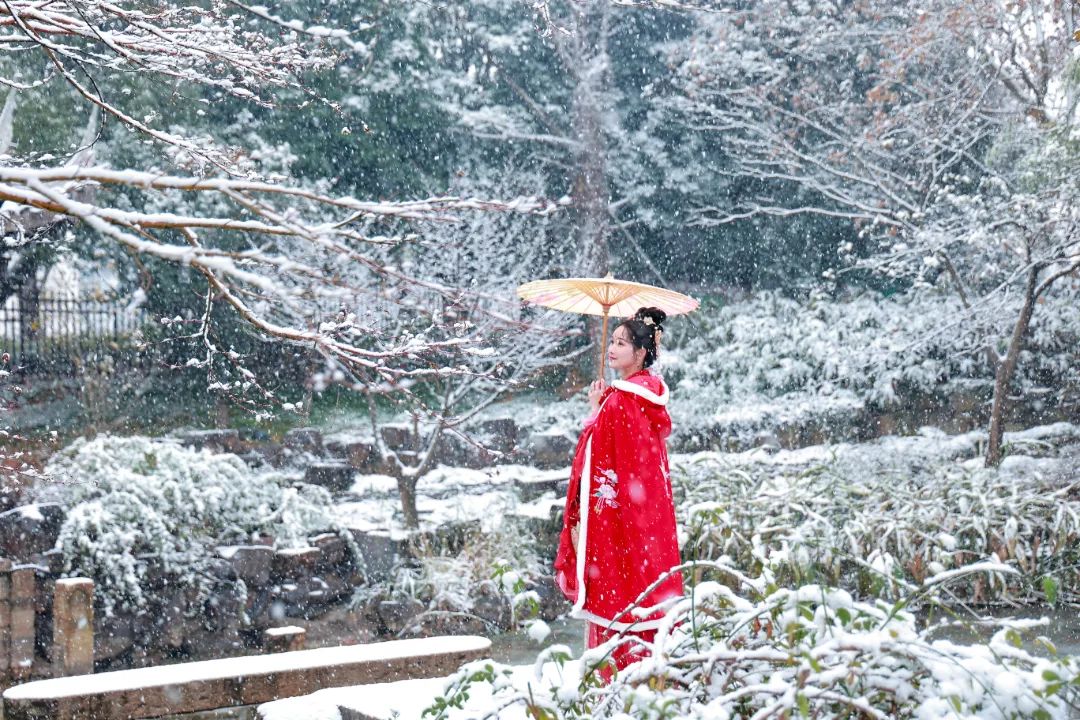 惠山古镇中,红墙染雪,充满诗情画意,树林缀雪,颇具古韵之美。