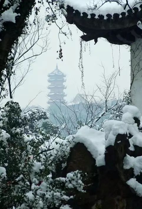 龙光塔静静矗立于山巅,远山载雪影,民居染白意,树木似琼枝,惠山的雪景,美得唯美梦幻!
