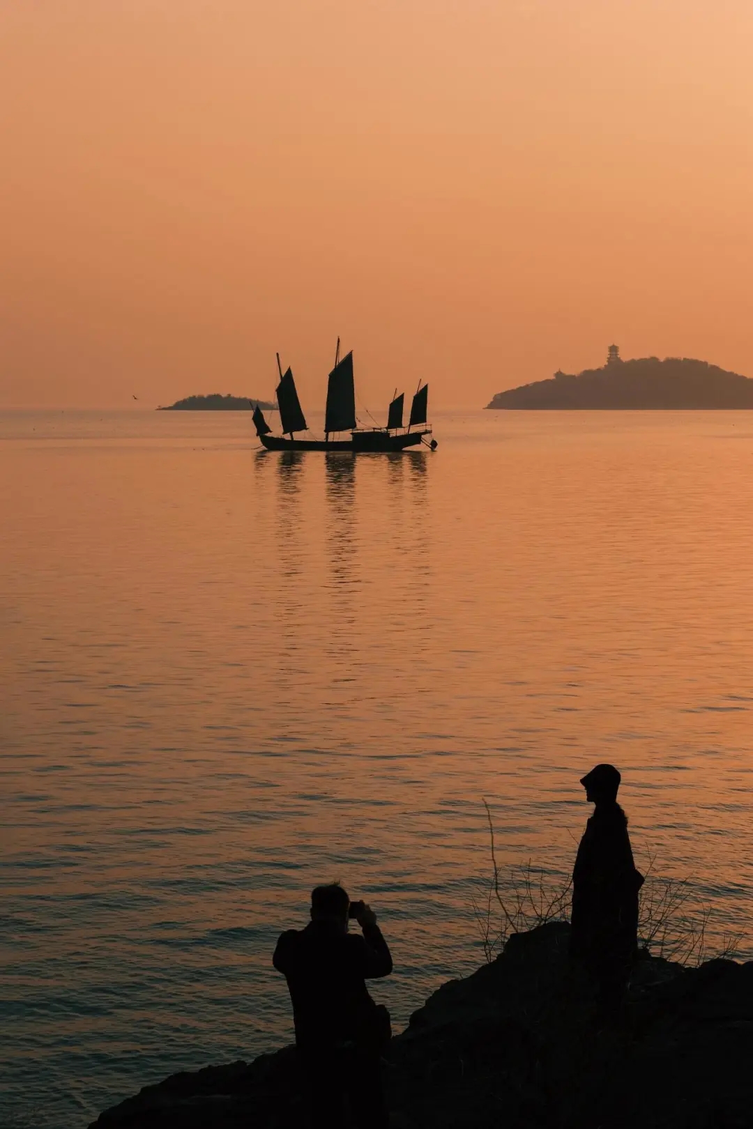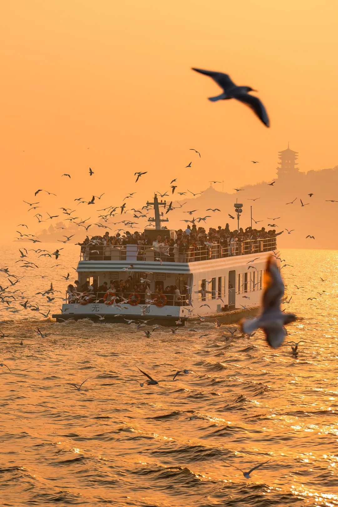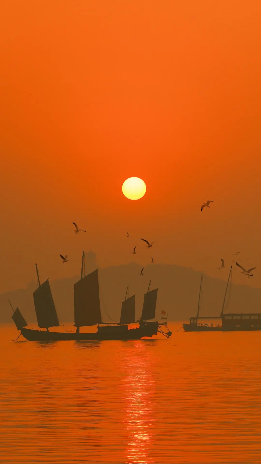 鸥遇橘子海,与红嘴鸥一起享受这份难得的宁静与浪漫。晚霞映照下的红嘴鸥,如同一个个身披金甲的战士勇敢地翱翔于天际。或停歇在轮船的桅杆上,享受着晚霞的余晖;或在空中盘旋,为轮船指引方向。