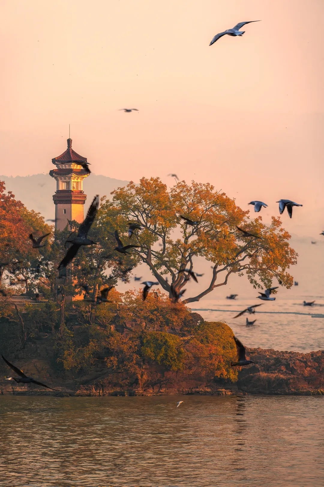 冬天的鼋头渚,是红嘴鸥与太湖互写的情诗。这些从西伯利亚飞来的小家伙,带着北方遥远的记忆飞越千山万水,只为在这片温暖的土地上找到属于它们的冬日家园。