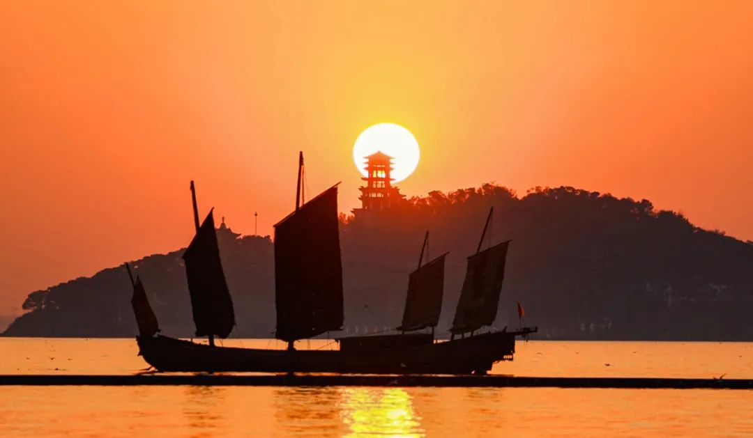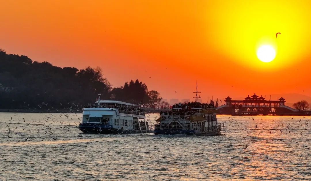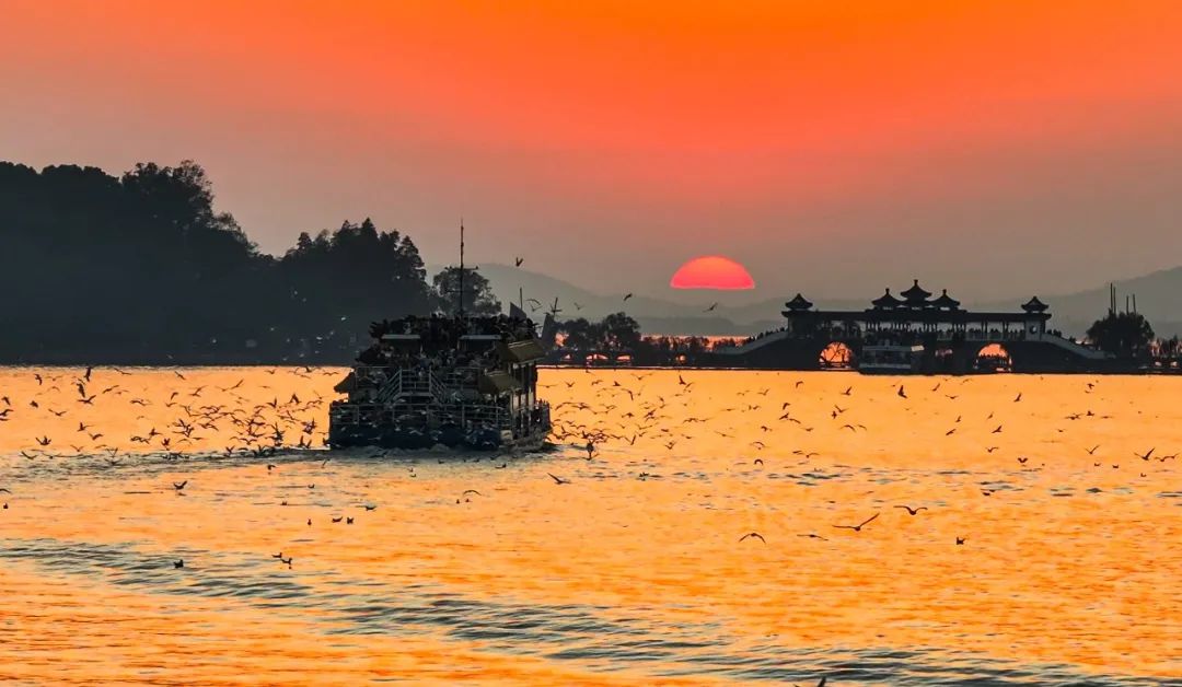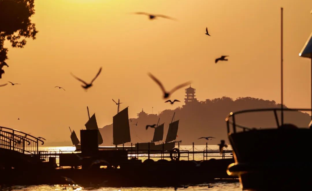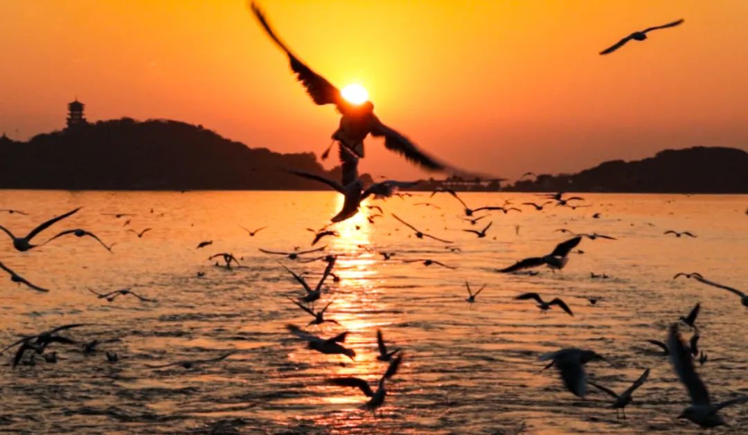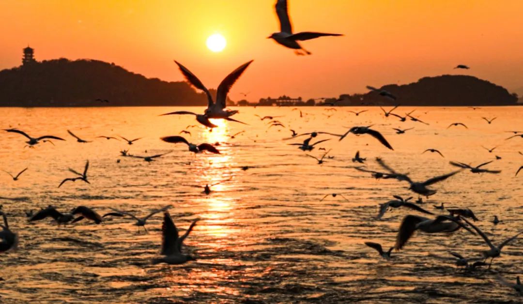 此刻,湖水、红嘴鸥和夕阳共同构成了一幅水墨图