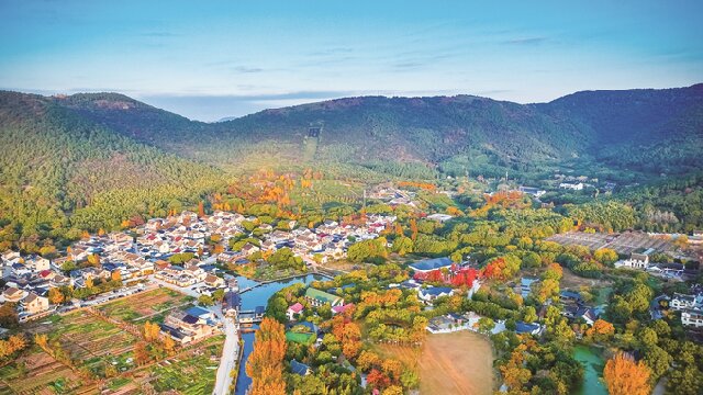 从叆叇岭入口沿石阶而上,森林中木质清香混合泥土气息,令人心旷神怡。徒步约2小时抵达山顶乾元寺,远处的太湖若隐若现,九龙潭如翡翠镶嵌在山腰,西施塘枫叶正红,宛如系在山间的红丝巾。俯瞰钱家坞,白墙黛瓦藏在茶竹深处,江南田园风光尽收眼底。