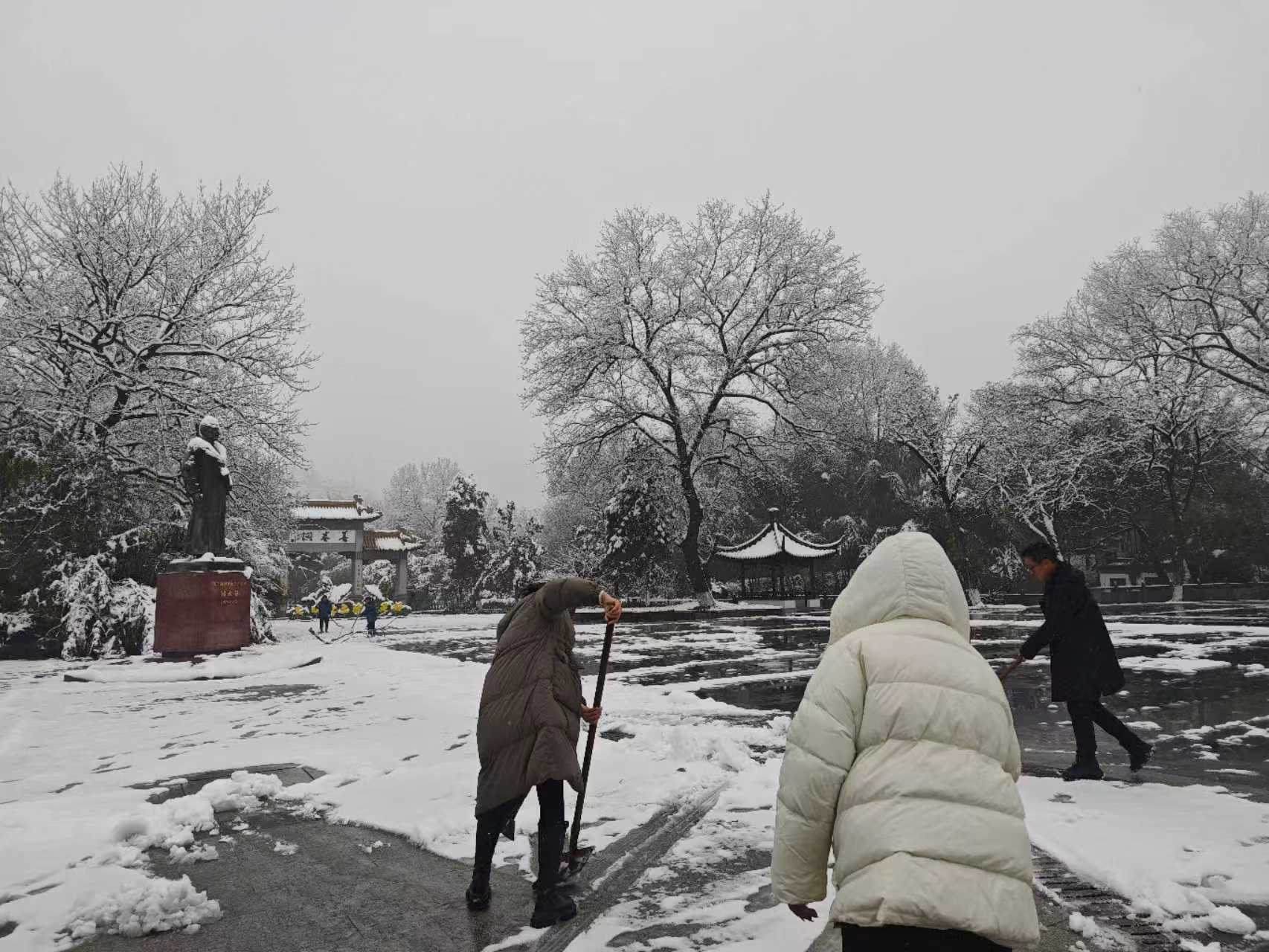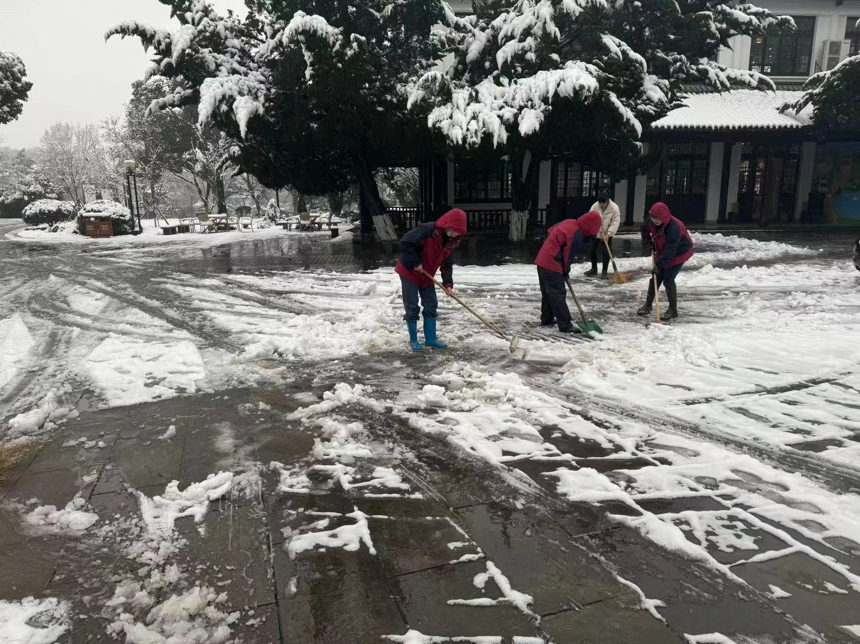 在开园前,每位员工都不畏严寒,干劲十足,做好景区出入口积雪的清理,设置“小心地滑”的标识牌,确保景区出入口游客行走区域无积雪。各部门员工在景区负责人的领导下以雪为令,挥锹抡帚,热火朝天的扫雪除冰,保障景区游客安全游览。在风雪中构筑起暖心屏障,为游客清扫出一条条“平安路”、“温暖路”。
