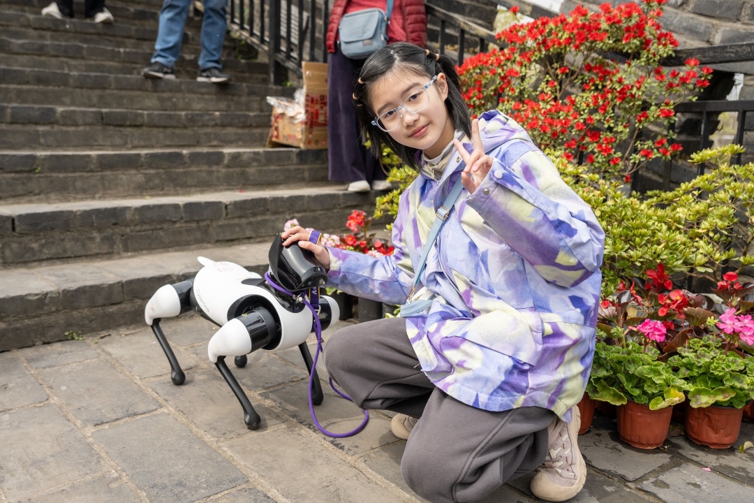 活动伊始,配备19组高精度环境传感器的AI机器狗以 “机甲萌宠”的科技形象精彩亮相。这些具备环境自适应能力的智能终端,不仅能通过多模态感知系统精准捕捉环境数据,更可借助自然语言处理技术与参与学生展开实时语音交互。在沉浸式体验环节,同学们通过手势识别系统与触控交互屏实现对智能终端的精准操控,零距离感受人工智能在运动控制、人机协作领域的前沿成果。当AI萌宠在古城墙平台完成翻滚、跳跃、后空翻等系列高难度动作时,科技美学与历史厚重感形成鲜明视觉对冲,现场迸发热烈反响。
