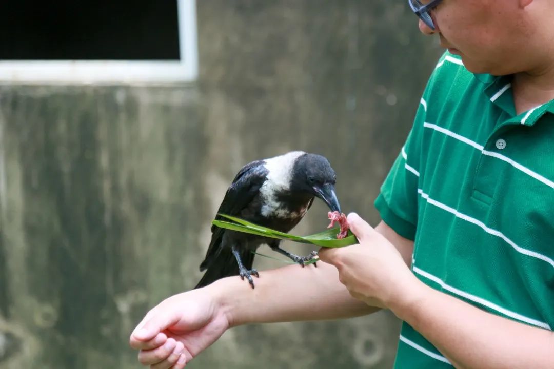 这只白颈鸦从雏鸟阶段就是人工喂养的,
