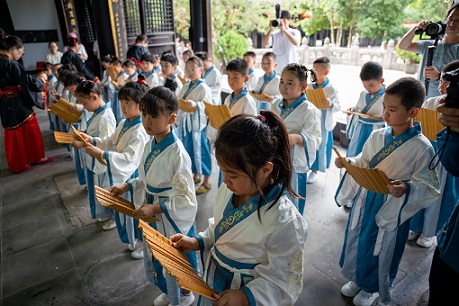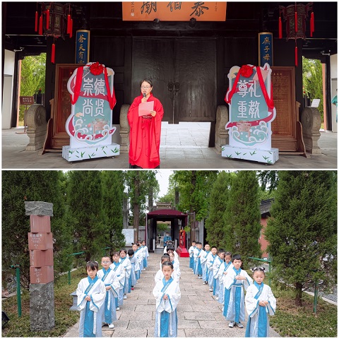 沃盥之礼是一个净身自新的仪式,孩子们有序排队,清洗双手,象征着内心的洁净和准备好接纳智慧,在日后的学习中心无旁骛。服冠之礼,孩子们检查衣扣、整理衣领、拉直衣角,保持衣冠的端正,意味着他们做好了准备,承担更多的责任和义务。从师之礼,孩子们叩拜泰伯像,齐声诵读《泰伯颂》,学习至德精神,表达对吴地先祖的崇敬。