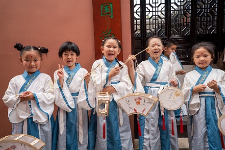《学记》:“入学鼓箧,孙其业也”,老师击鼓三响,意在警醒,引起学生对读书的重视。孩子们击鼓三响,寓意从此明确志向,立志远大。