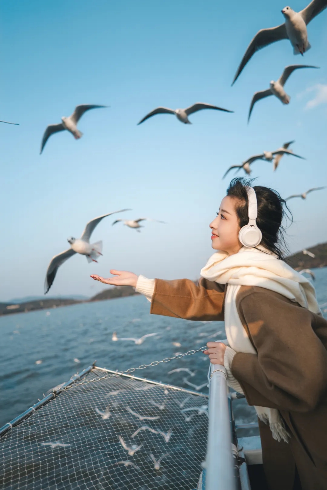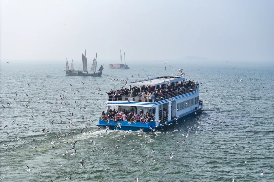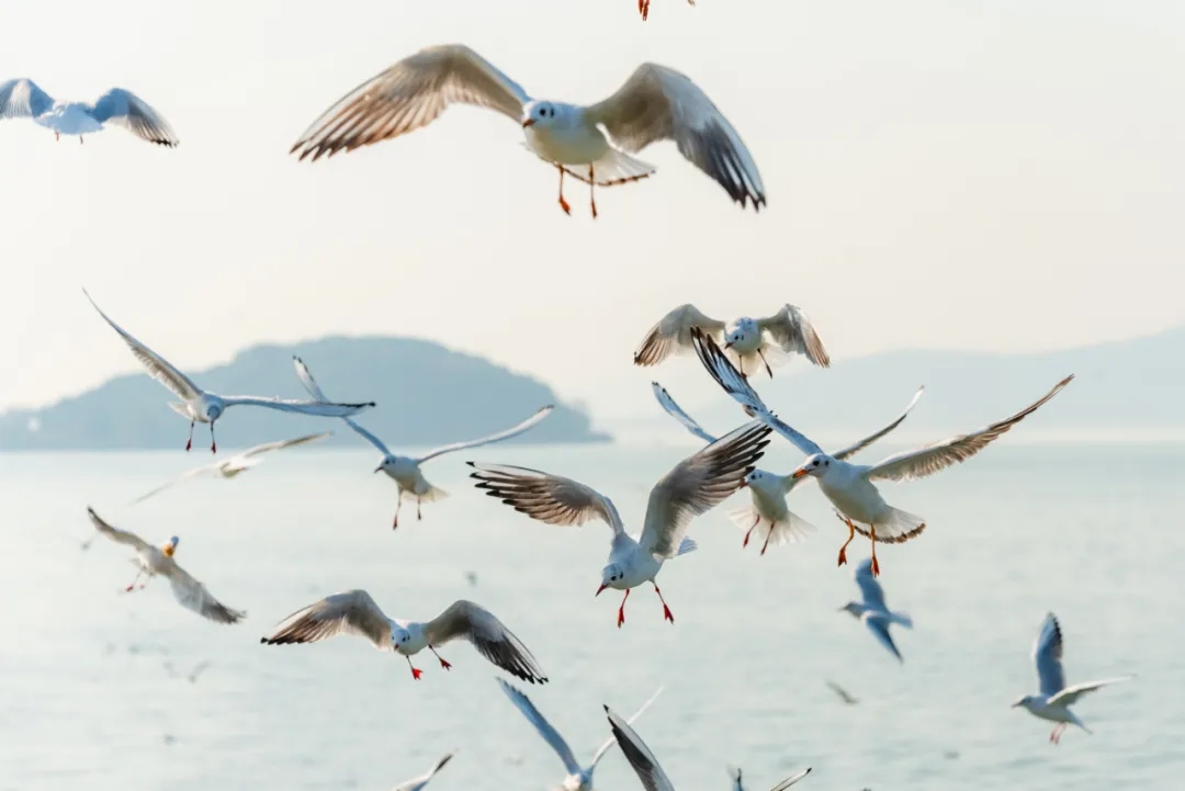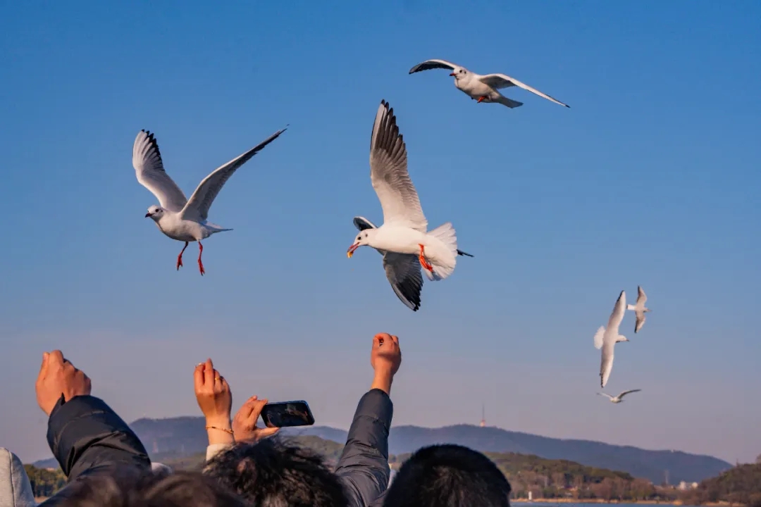 在鼋头渚,红嘴鸥与游人之间形成了一种独特的默契。游人们投喂食物时,红嘴鸥会优雅地俯冲而下,精准地接住抛向空中的食物。它们并不惧怕人类,反而展现出一种亲近的姿态。这种互动,展现了生命之间最纯粹的信任与善意。