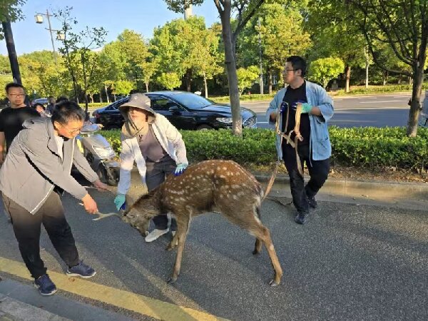 梅花鹿在公园的一片树林里,兽医找好位置,“快、狠、准”,利用吹麻技术将动物麻醉。兽医和保育员将麻倒后的梅花鹿保定,随后梅花鹿被送往太湖湿地公园,兽医给动物注射解药,梅花鹿苏醒,得到妥善安置。
