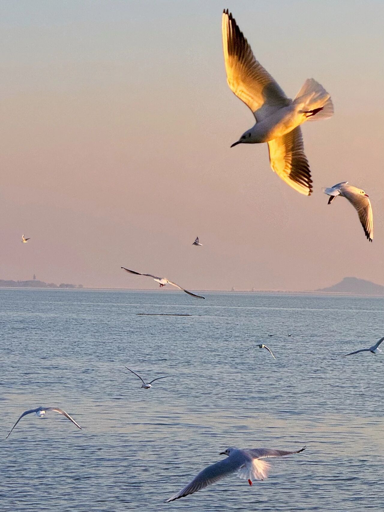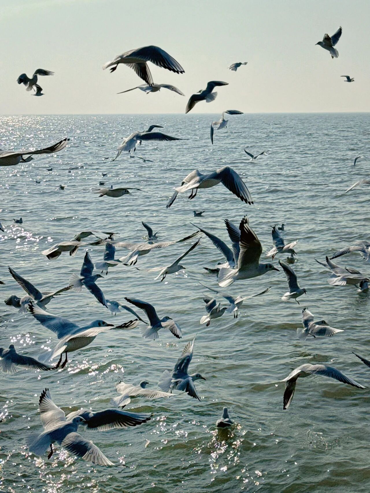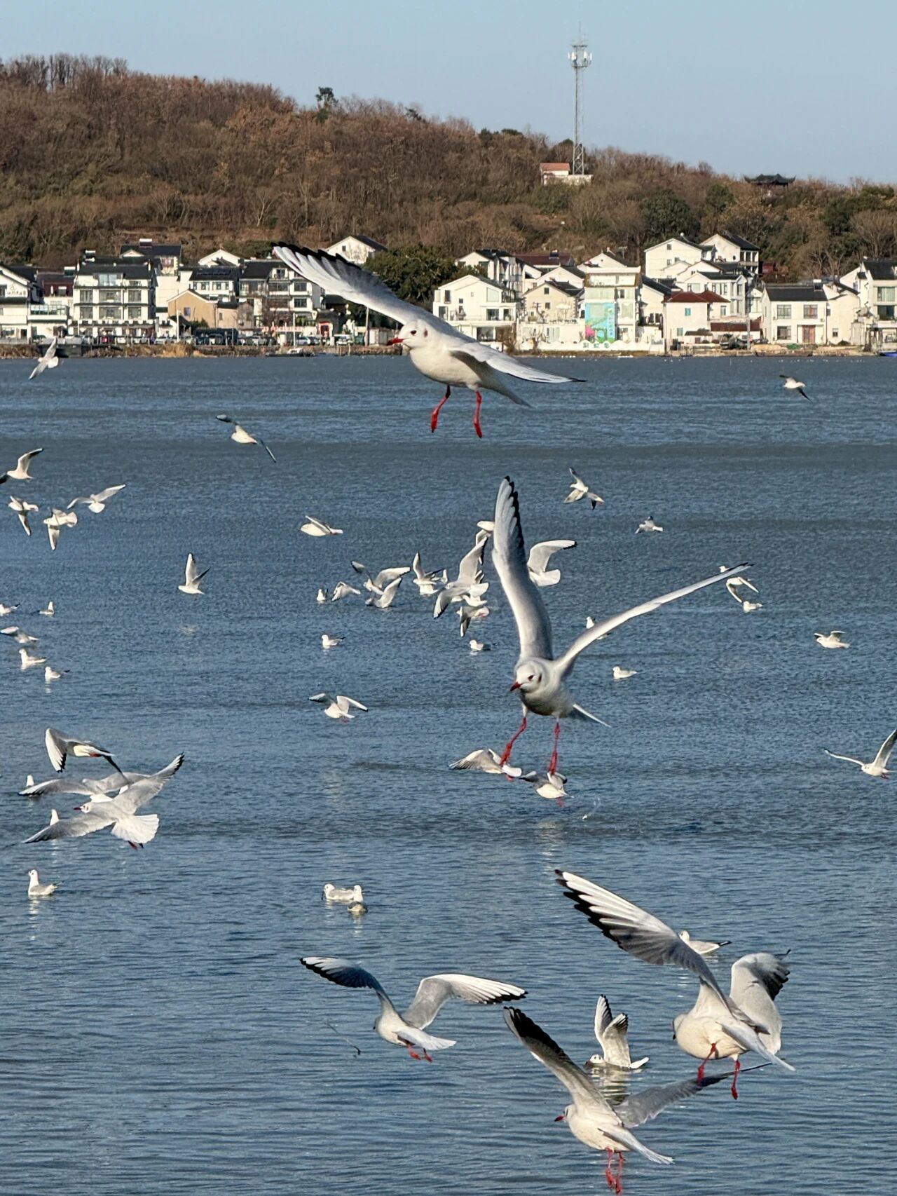 数百只红嘴鸥在湖面上盘旋、嬉戏,时而低空掠过水面叼起鱼虾,时而围绕着游人展翅翻飞,争食的模样憨态可掬。阳光下,洁白的羽翼泛着光泽,与潋滟的湖光相映成趣,为略显萧瑟的冬日注入了满满生机与野趣。站在湖岸远眺,水光粼粼,万鸥齐翔,耳边是波涛拍岸的轻响,夹杂着红嘴鸥清脆的啼鸣,两种自然之声交织成冬日独有的交响,治愈感十足。