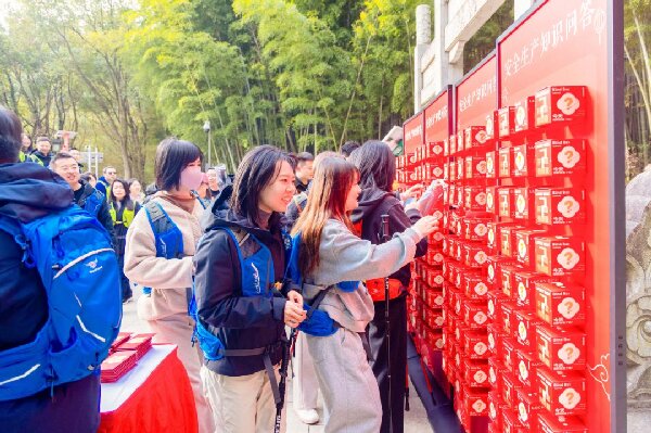 本次活动将全民健身与安全生产宣传深度融合,把安全常识普及、安全意识强化融入登高全过程。在叆叇岭登山步道口,现场设置了“安全生产知识盲盒问答”环节,盲盒内题目涵盖安全生产、森林防火等相关知识,参与者自主抽取盲盒答题,回答正确即可领取精美小礼品,在趣味互动中提升安全认知。