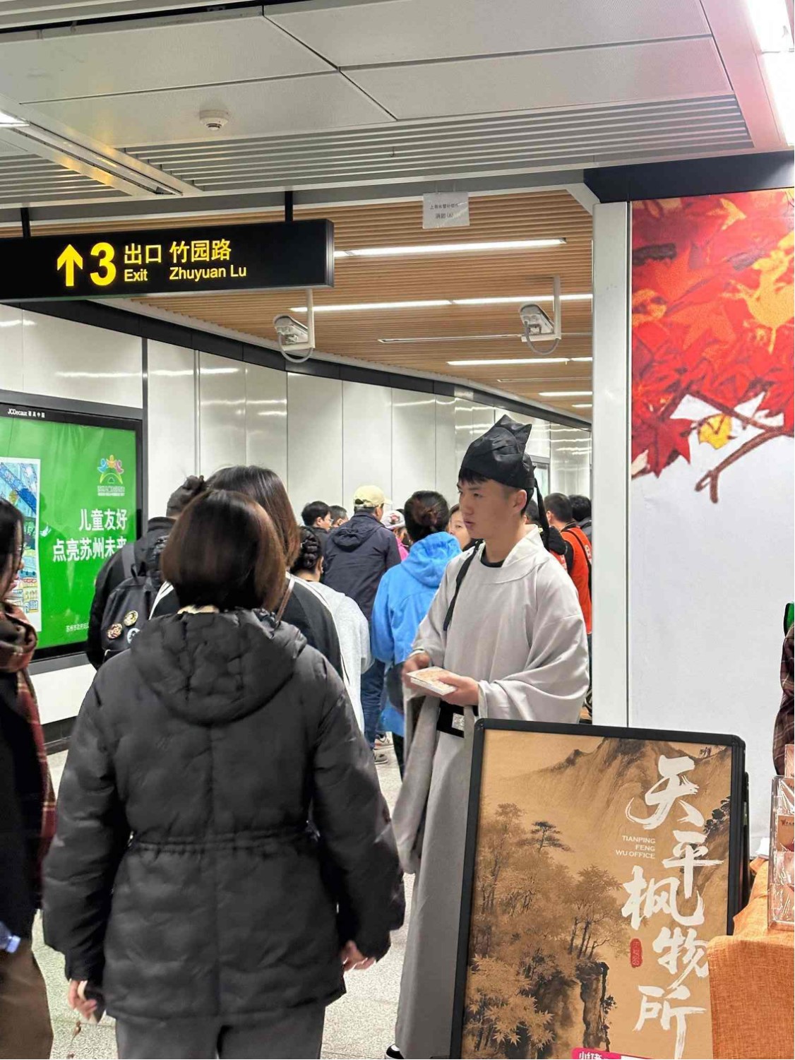 每逢周末,前往天平山的道路时常面临拥堵压力。为此,景区主动将服务关口前移,在游客抵达的首个交通枢纽——木渎站,便设立醒目的引导点。该点位以秋季主打的“红枫”为主题进行装饰,氛围感十足。更引人注目的是,身着古装的工作人员作为互动NPC,不仅为往来游客提供清晰的交通指引、景点信息咨询,还通过风趣的互动,提前渲染游园氛围。